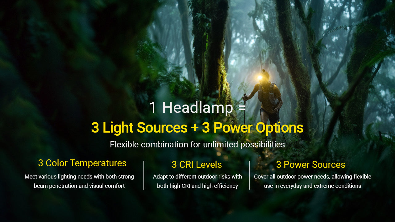 One headlamp adapts to every outdoor condition. Three color temperatures and three power options in a single 75-gram package.