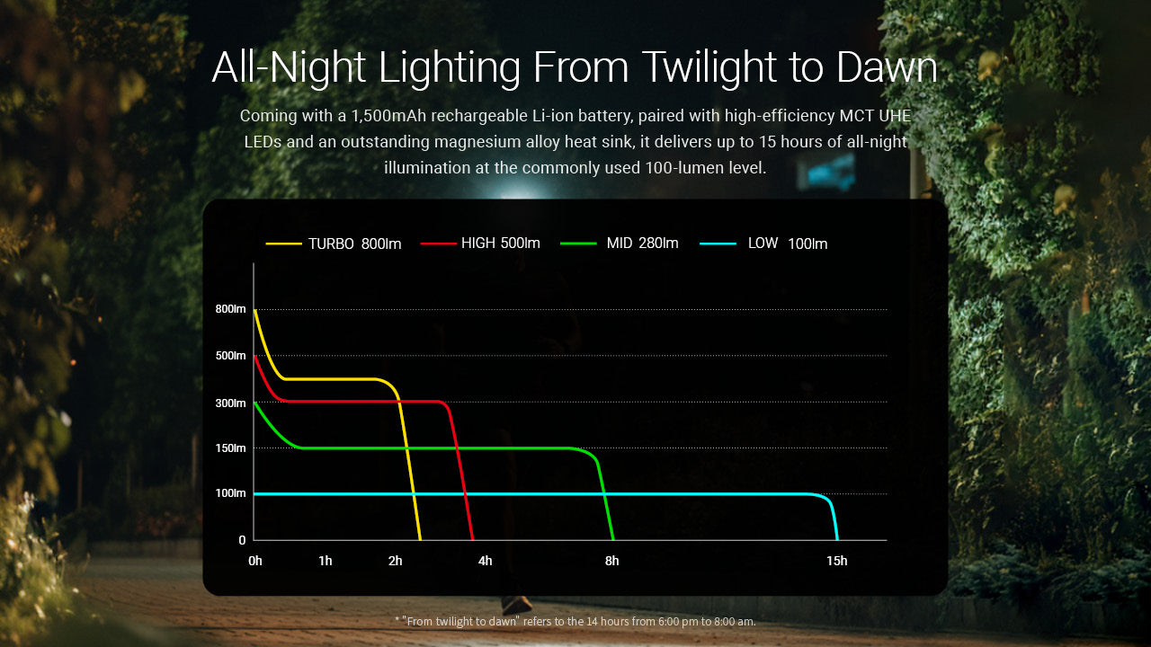 800 LUMENS REACHES 150 METERS - Maximum output illuminates distant trail markers, identifies landmarks during navigation, or assists with search tasks. The broad flood beam reveals terrain details across your field of view.