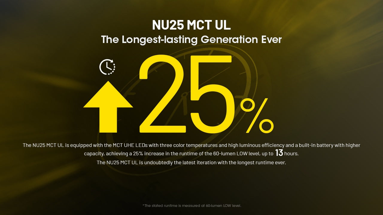 The NU25 MCT UL delivers serious illumination from a package that weighs less than two AA batteries.