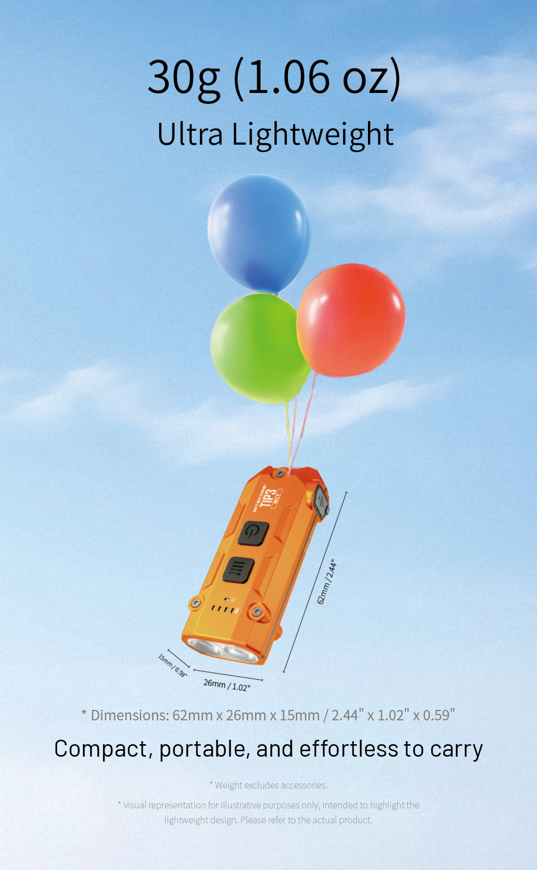 At 30g (1.06 oz), the TIP3 weighs less than a AA battery or two US quarters. Most people forget it's there after the first day. For reference, the dimensions are 62mm × 26mm × 15mm—about the size of a car key fob. If weight is a concern, use the clip to attach it to your bag or pocket instead of your keychain.
